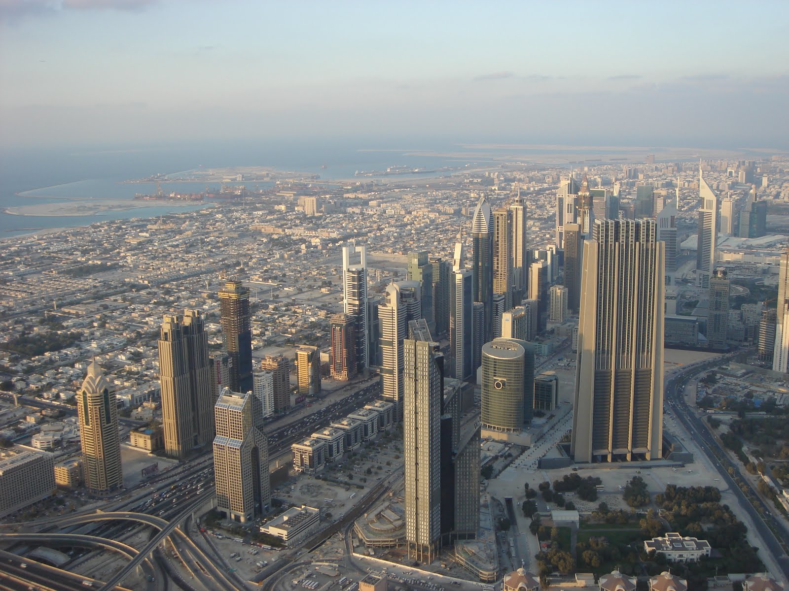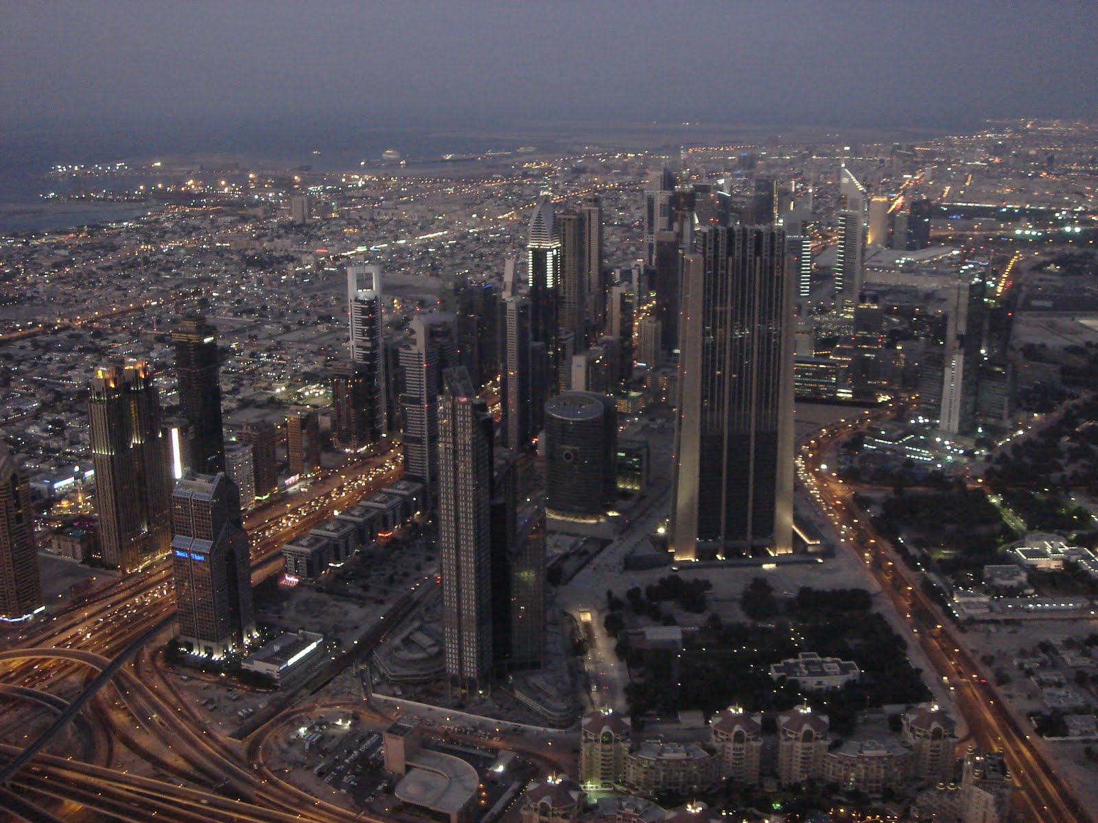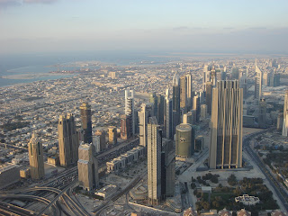 the building to flex with the wind and rotation of the Earth. Without this feature, the torque on the top of the building would be too great and it would bend or buckle somewhere in the middle, eventually failing and the whole thing would topple over. The top of the Burj can sway up to 1 meter in any direction. Pretty amazing. The view from the outside observation deck shows the city that lies north of the Burj Khalifa. The cluster of buildings lining Sheik Zayed road is known as the financial district of Dubai. Here is a picture of the financial district before sunset and a little while after