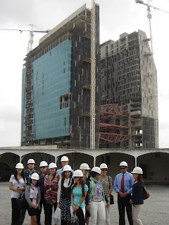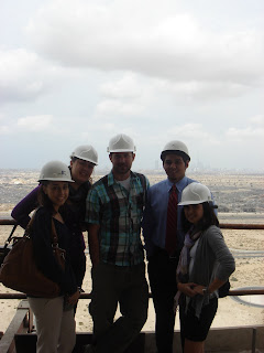It was nice of them to bring us up here i suppose, but i don't really get the point of it. Maybe to show us the whole area of Dubiotech and where it will reach when it's all completed. The unfinished building we are in is the center of the Dubiotech research park. They talk about some of the challenges they faced, including the truss structure in the middle of the buildings. It's a really unusual shape and require three separate structural engineers evaluating it to convince them it was structurally safe. When the building is done, that will be a conference center as well as hold some retail stores and be a bridge between the two buildings. It is also going to be covered in windows, and the shape of it will make it look like a jewel suspended between the two buildings. Sounds cool, but it looks like it will be a while before we can see it. Some people take the lift back down, while others (including me) take the stairs. This turned out to be not so great an idea because we had to climb over and through scaffolding in several places and walk through points where the stairwell was pitch black. It could have been considered mildly adventurous though, so i didn't mind.