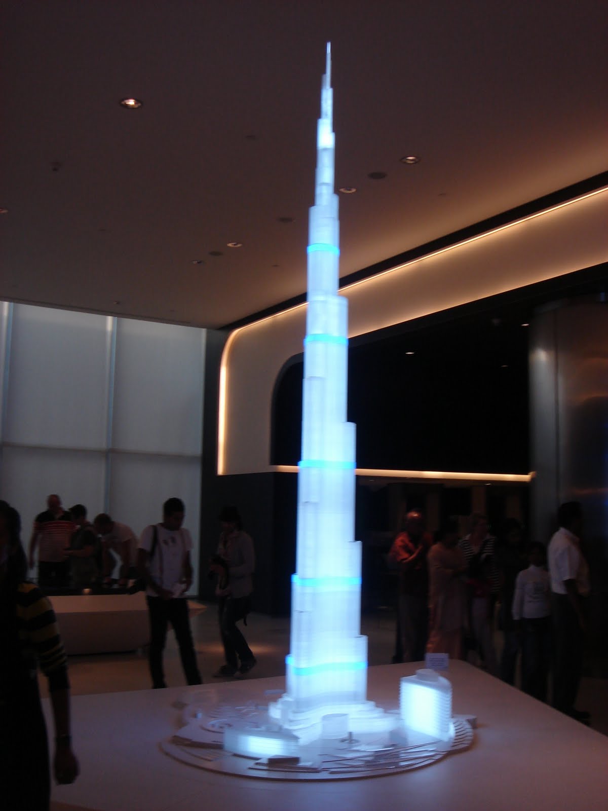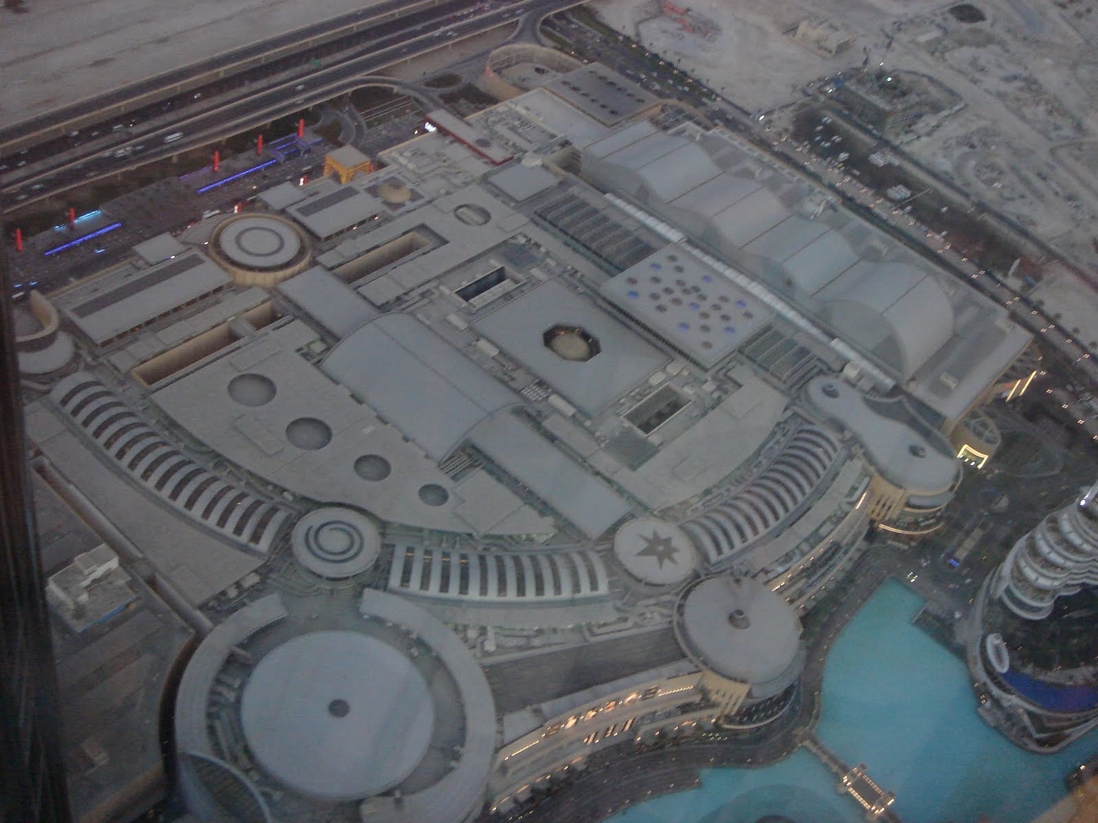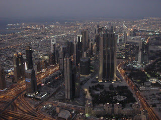 when the lights of the city begin to come on. We are told that you can watch the sunset from the ground and then ride the elevator up to the top of the Burj to watch it set again. You'd have to be very fast and be able to cut all the lines first though, because it takes a while to get through security and into the elevator. Looking toward the east from the observation desk, you can see the city begin to sprawl into the desert. You can also see the Dubai mall directly below and see just how large it really is. We went to the mall when we got down, but it's not very impressive outside the fact that it's