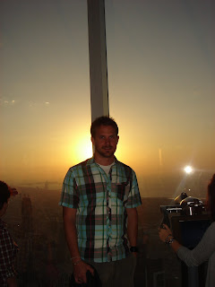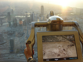 the top of the Burj Khalifa to watch the sunset. The tallest building in the world is 165 stories tall, but people going to the top only get up to the 124th floor where the observation deck is. The ride to the top only takes about 60 seconds, and you can feel your ears popping every few seconds as you go up. On the way down, i counted my ears popping 7 times. The view is pretty awesome. There is no such thing as a clear day in Dubai anymore with the pollution and haze from blowing sand, but today isn't bad. The clouds have cleared away and we are able to see great distances. One of the cool things is the telescopes at the top. They didn't cost anything today for some reason, and they are essentially just a video screen you can point and magnify. They also have 4 settings, a live feed of what you can see right now, a daytime setting to see what it looks like on a particularly clear day during mid-day, a night